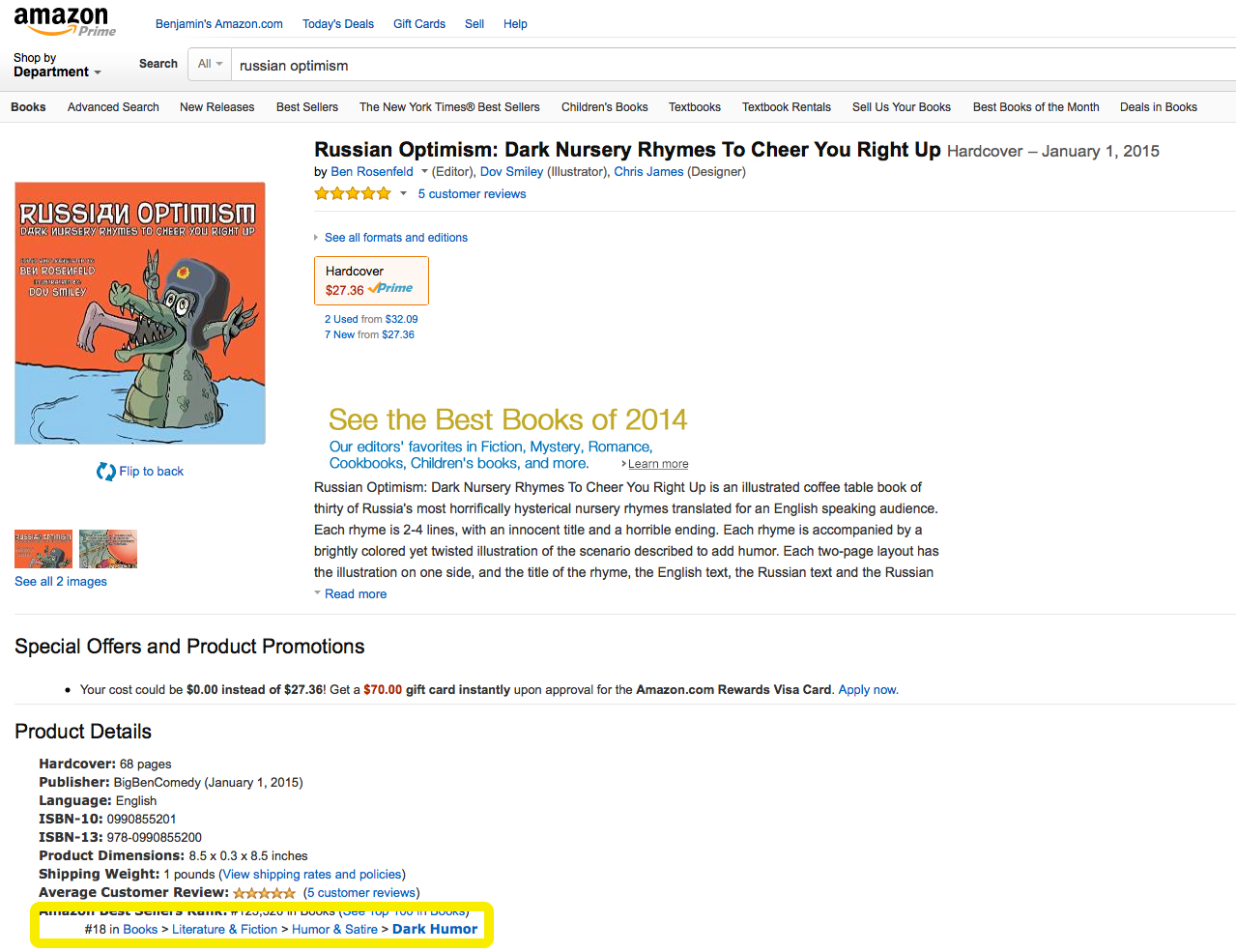 I’m proud to announce that my new book “Russian Optimism: Dark Nursery Rhymes To Cheer You Right Up” has been consistently spending time in Amazon’s Top 100 Best Sellers in Dark Humor and has been as high as number 18.